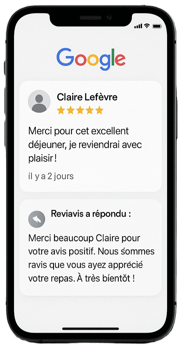 Reviavis répond automatiquement à vos avis Google avec des messages humains et professionnels.